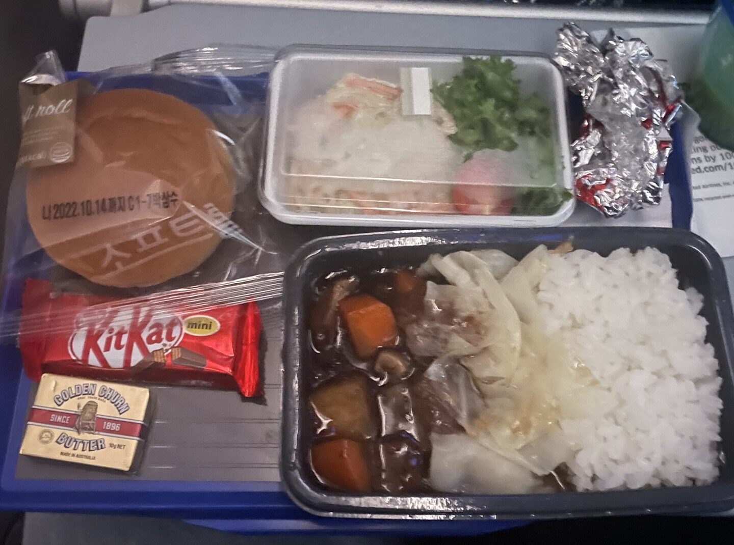 기내식은 닭고기와 소고기 중 선택할 수 있었는데, 나는 소고기를 선택하였다. 고기는 일반적인 소고기 장조림과 비슷한 맛이었으나, 야채에서는 비린 맛이 강하게 느껴졌다. 밥을 다 먹은 뒤 곧바로 소등되었다.