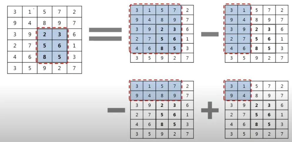 누적합 배열을 사용하면, 원본 배열 A의 임의의 직사각형 영역의 합을 아래 공식으로 O(1)에 계산할 수 있습니다.