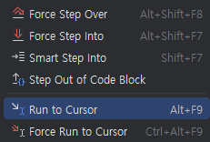 - Run to Cursor: 브레이크 포인트 없이 커서가 위치한 지점까지 실행한다.
