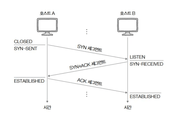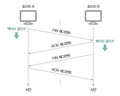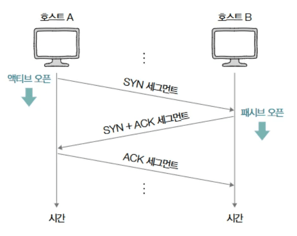 - 액티브 오픈 (Active Open): 먼저 SYN을 전송하여 연결 요청을 시작하는 호스트 (예: A).
