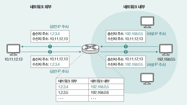 NAT는 내부 네트워크(사설 IP 대역)를 사용하는 호스트들이 외부 네트워크(인터넷)와 통신할 때, 내부에서 사용하던 사설 IP 주소를 외부에서 사용 가능한 공인 IP 주소로 변환해 주는 기술입니다.