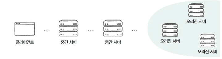 현실의 네트워크에서는 클라이언트와 단일 서버가 같은 네트워크 내에 존재하지 않고, 여러 중간 장비와 서버가 존재합니다. 이때 오리진 서버(origin server)는 자원을 생성하고 클라이언트에게 응답을 제공하는 최상위 서버를 의미합니다.